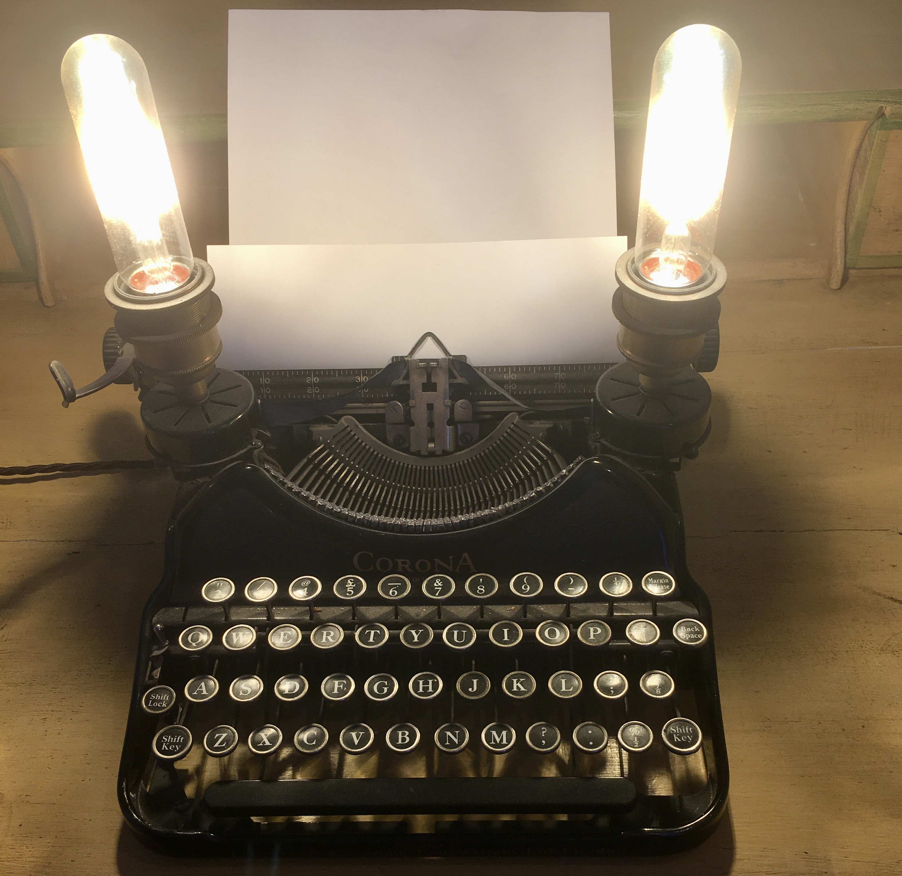 Firstly, in the living room there is a dedicated antique writing desk near the window, with plug sockets nearby (UK 3-pin and French 2-pin). The area is well-lit, with a wall-spotlight above, a light (converted from an old typewriter) to the side, and a book-light on the desk.